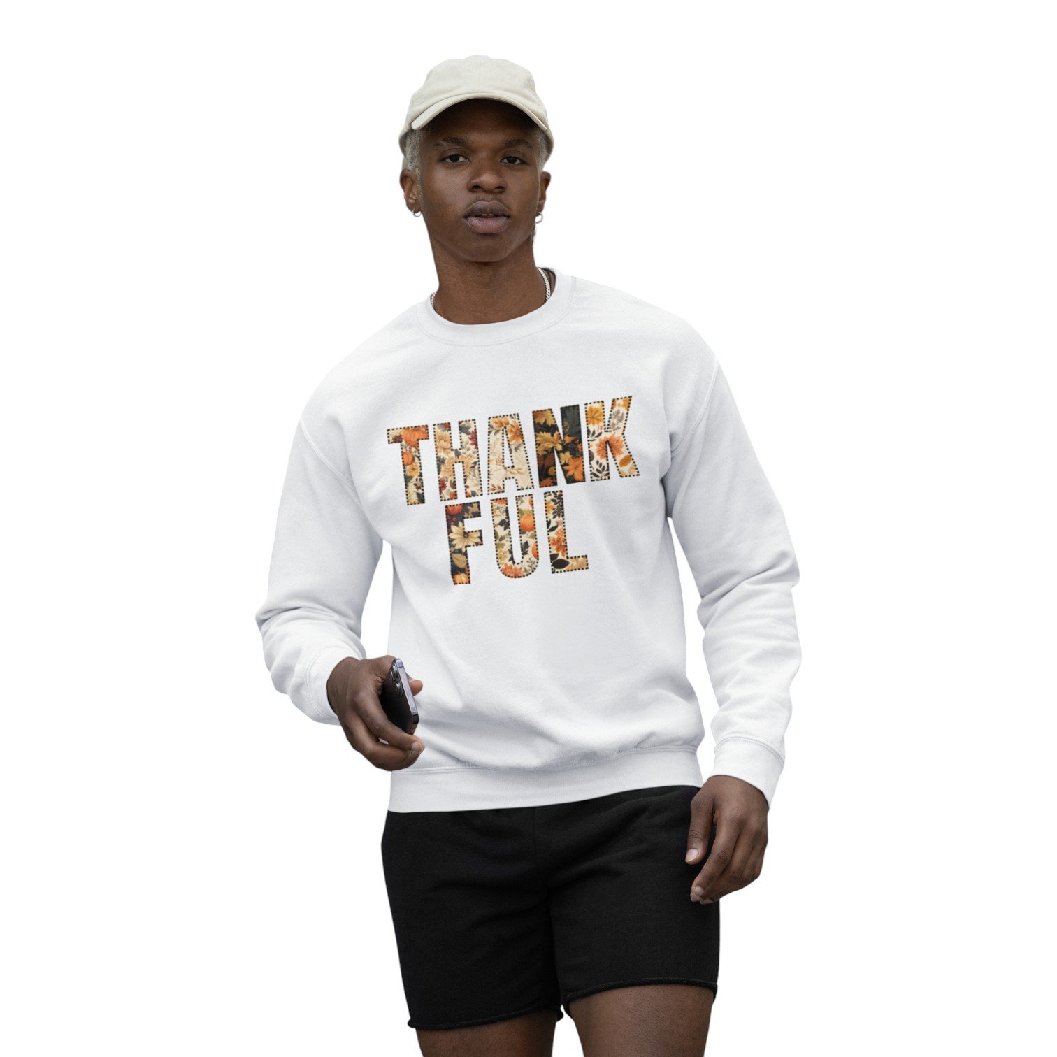 This unisex pullover features bold “THANKFUL” lettering filled with warm fall floral patterns, bringing cozy autumn vibes to any outfit. Available in Pink, Gold, and White, each color offers a unique and stylish look perfect for Thanksgiving gatherings, fall outings, photoshoots, and everyday wear.